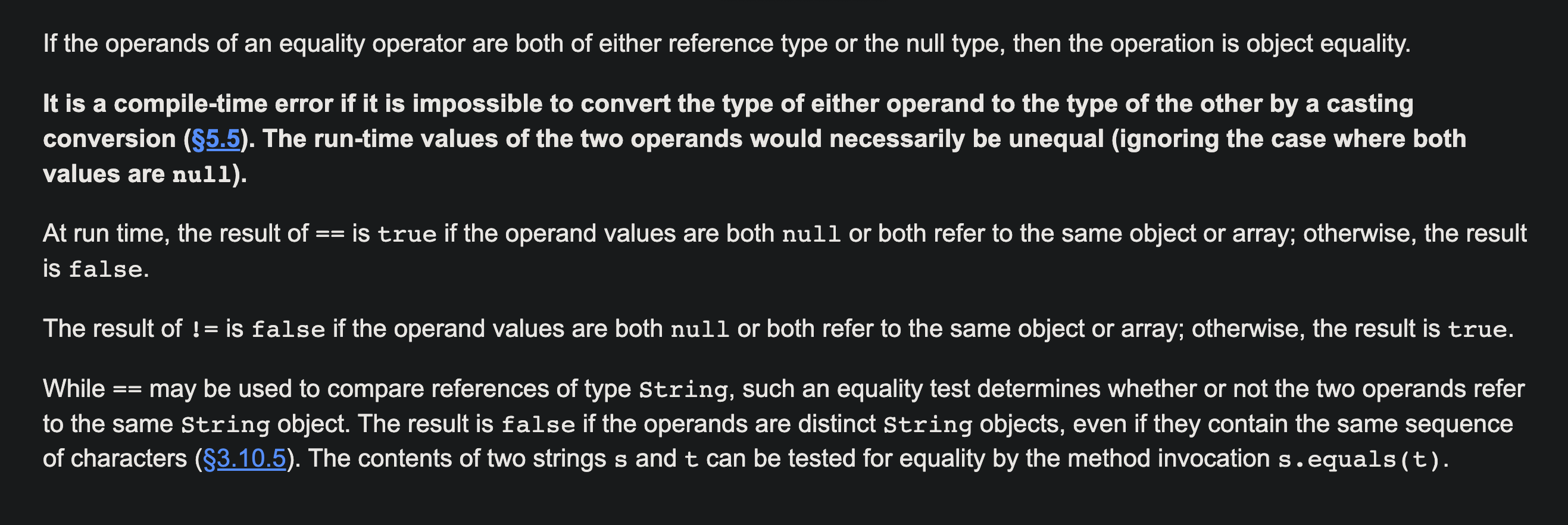 JLS, 15.21.3 Reference Equality Operators == and != 를 보면 해당 내용에 대한 설명이 잘 나와있습니다. (마지막 문단)