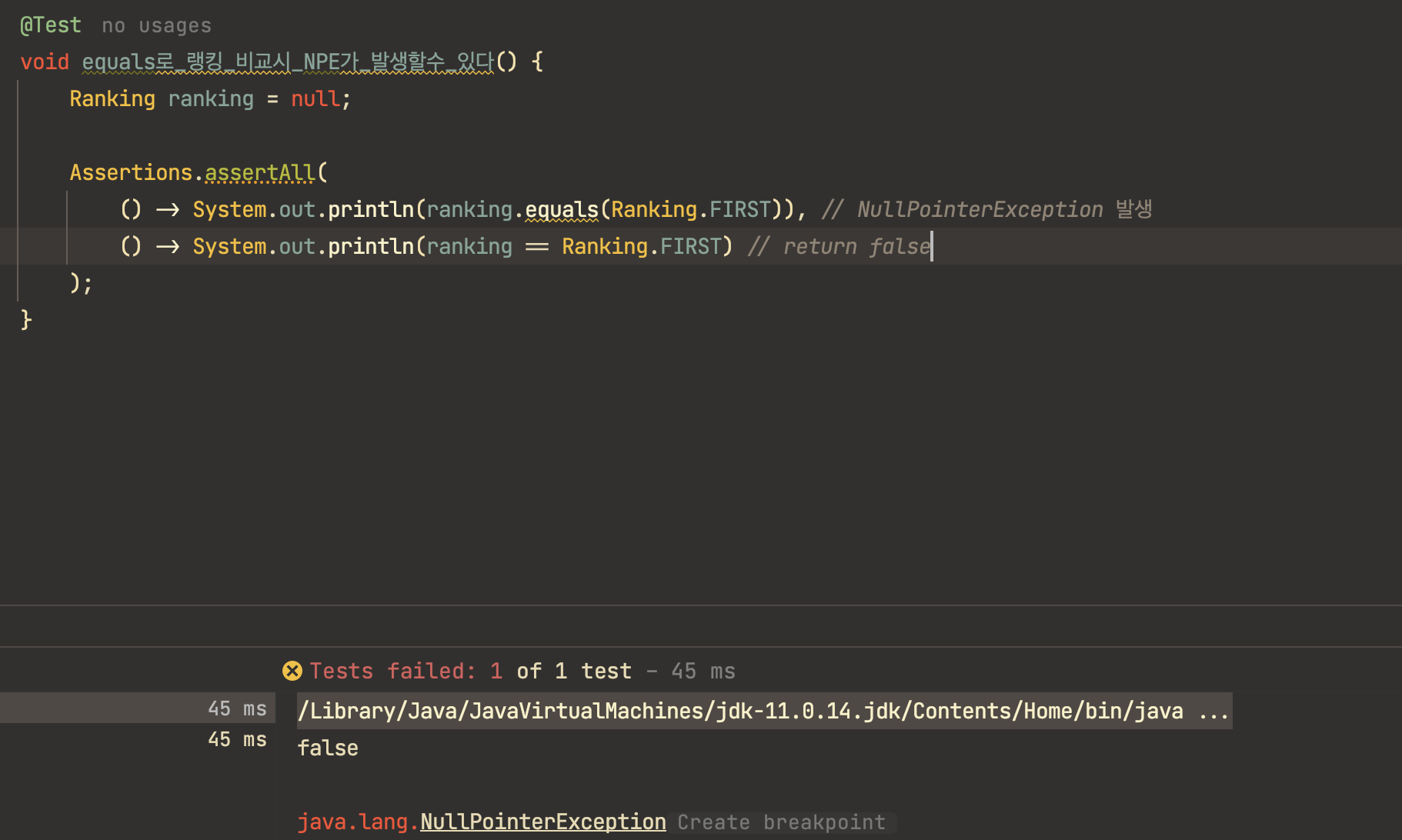 물론 다음과 같이 비교하면 equals에도 NullPointerException을 피할 수 있습니다.