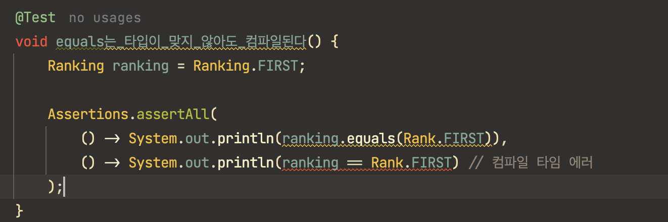 2. 위에서 살펴본 것처럼, == 비교는 컴파일 타임에 타입 미스 매치를 잡아줍니다.