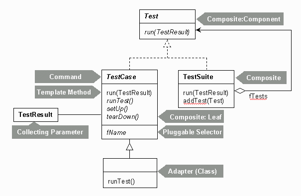 다음 그림은 패턴으로 설명된 JUnit의 디자인을 한눈에 보여줍니다.