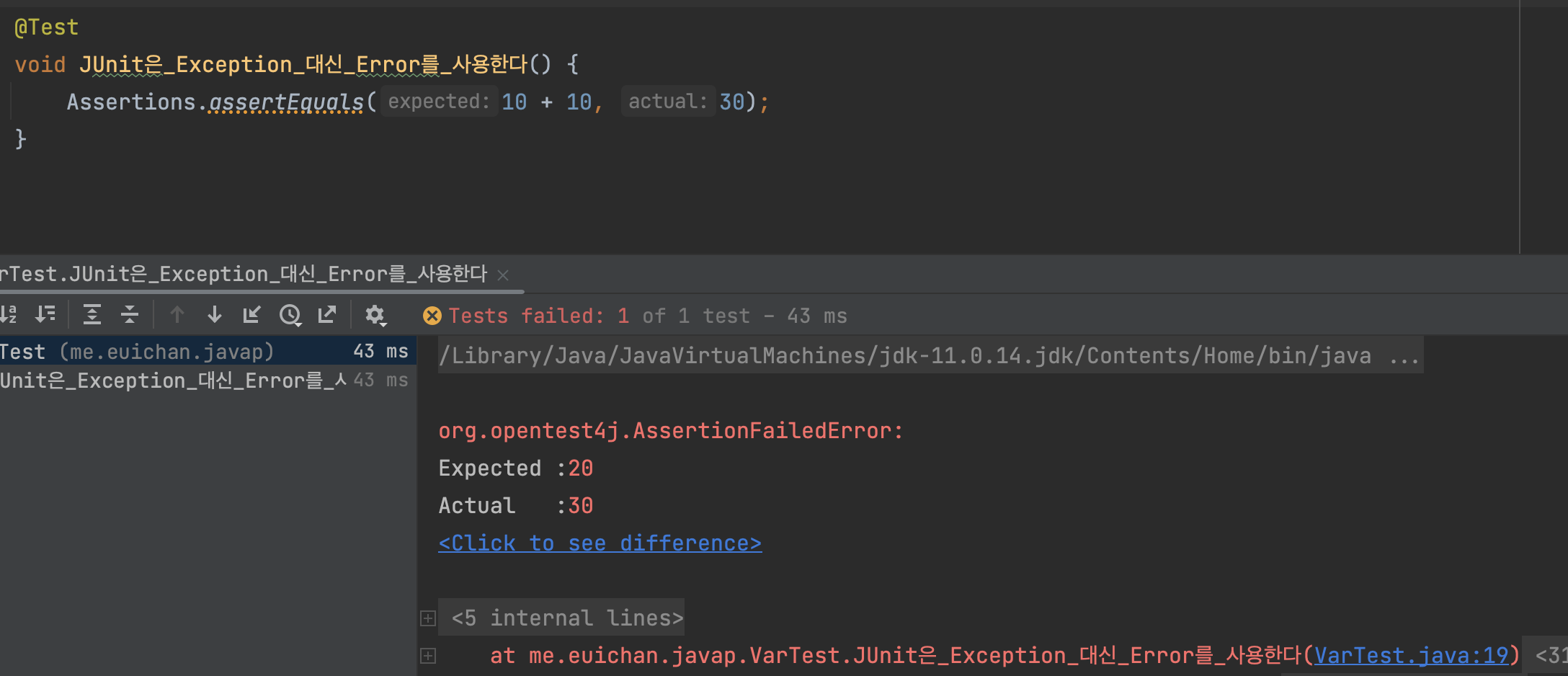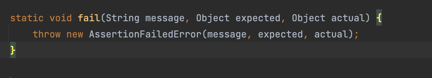 테스트를 작성한 후, assertEquals로 runTestFail 과 비슷한 로직을 비교해보면 AssertionFailedError가 발생함을 알 수 있습니다.