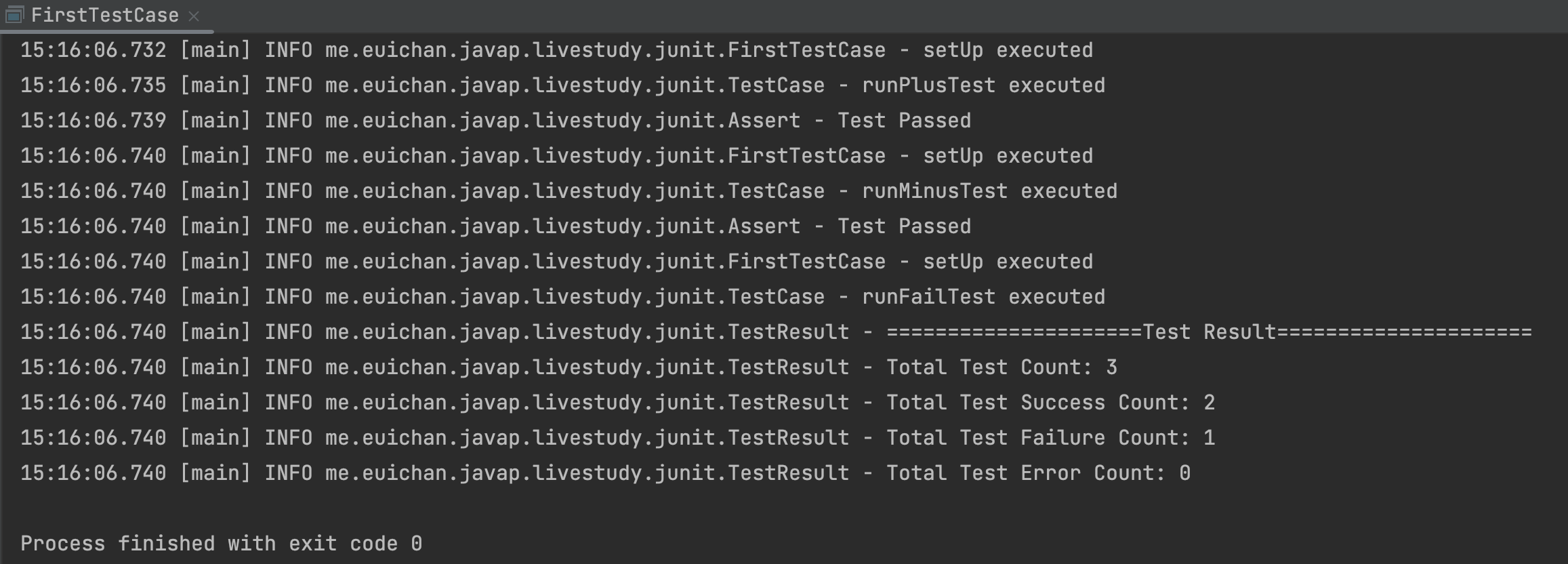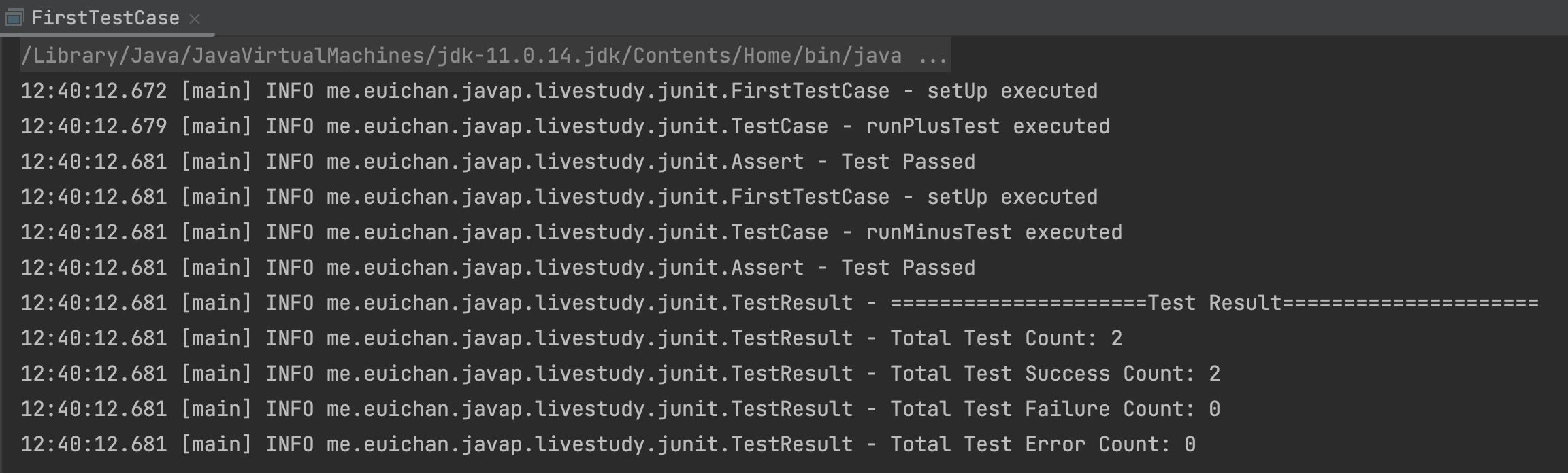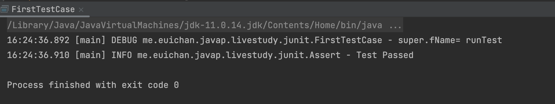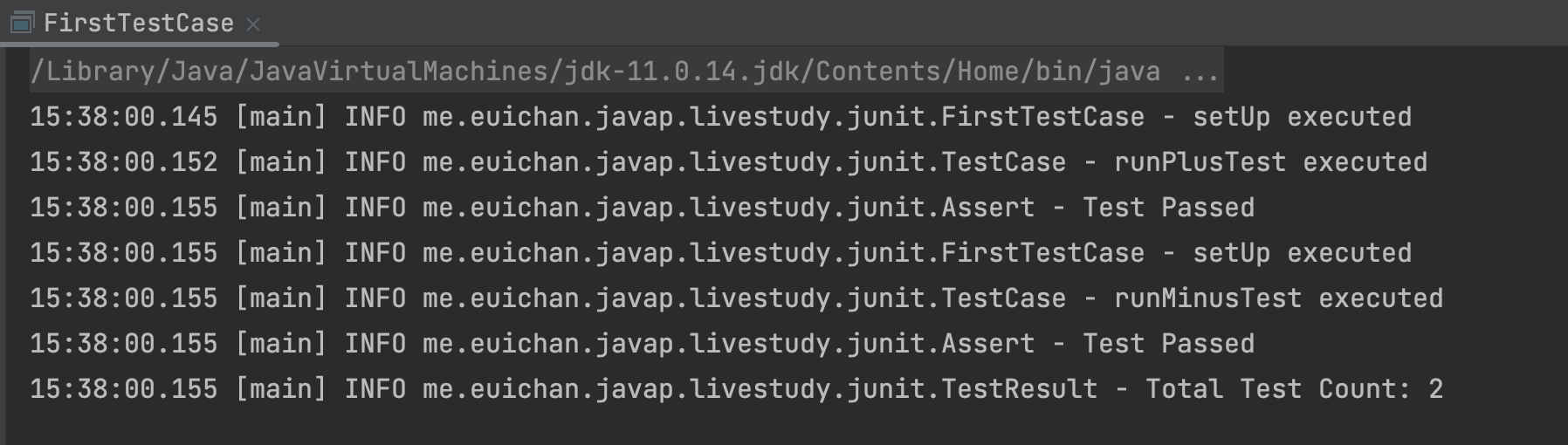 FirstTestCase의 main 메서드를 실행하면, Test가 통과된 것을 확인할 수 있습니다.