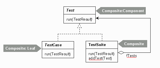 - Composite: Component 인터페이스를 구현하고 Leaf의 컬렉션을 관리 (여기선 TestSuite)