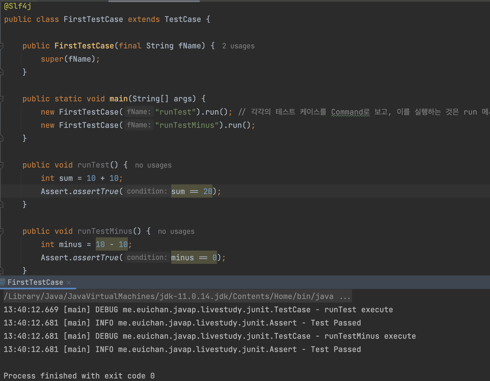 이제는 테스트 케이스 메서드들을 여러개를 생성하고, 실제 main 메서드에서는 해당 메서드들의 이름만 추가하면 테스트를 실행할 수 있습니다. runTestMinus() 라는 메서드를 추가해보겠습니다.